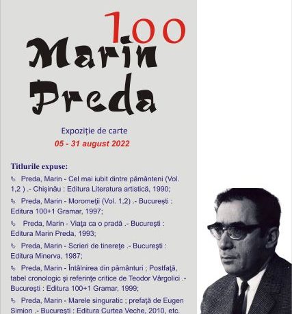 Biblioteca Județeană „Alexandru și Aristia Aman”, prin serviciul Depozit General și Săli de Lectură, organizează expoziția „Marin Preda – 100 de ani de la naștere (1922-1980)”. În perioada 5 – 31 august 2022, în salonul Expozițional de la parterul instituției, vor fi expuse volume ale scriitorului Marin Preda, din fondul de carte al Bibliotecii Județene „Alexandru și Aristia Aman”. Dintre titlurile expuse, amintim: Preda, Marin – Cel mai iubit dintre pământeni (Vol. 1,2 ) .- Chișinău : Editura Literatura artistică, 1990 Preda, Marin – Moromeţii (Vol. 1,2) .- București :…