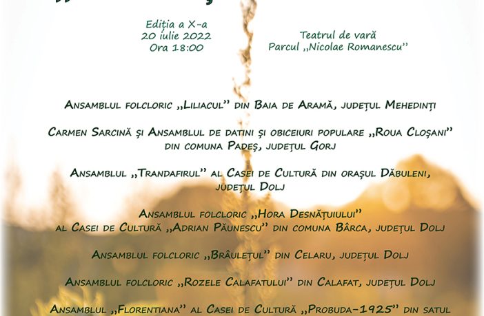 Consiliul Judeţean Dolj şi Centrul Judeţean pentru Conservarea şi Promovarea Culturii Tradiţionale Dolj, cu sprijinul Operei Române Craiova, Primăriei şi al Consiliului Local Municipal Craiova, organizează miercuri, 20 iulie 2022, cu începere de la ora 18:00, Festivalul de datini şi obiceiuri „Tradiţiile verii“, ediţia a X-a, la Teatrul de vară din Parcul „Nicolae Romanescu“. Ansambluri din judeţele Dolj, Gorj, Mehedinți și din Bulgaria vor aduce pe scenă obiceiuri specifice sezonului estival, pe care le regăsim în lumea satului: Sânzienele sau Drăgaica, Paparudele, Primul colac, obiceiuri cu o simbolistică aparte, în…