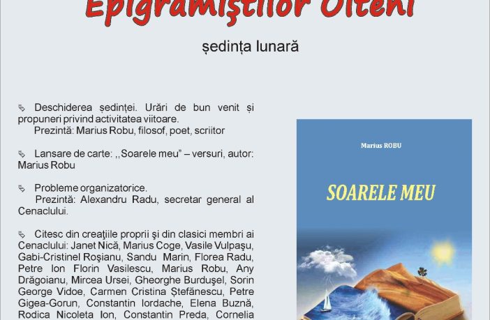 Biblioteca Județeană „Alexandru și Aristia Aman” găzduiește vineri, 1 iulie 2022, la ora 15.00, în sala „Acad. Dinu C. Giurescu”, ședința lunară a Cenaclului Epigramiștilor Olteni. În cadrul ședinței va fi lansat volumul de versuri „Soarele meu”, autor Marius Robu și se vor discuta detaliile organizatorice ale activității cenaclului. De asemenea, vor citi din creaţiile proprii şi din clasici membri ai Cenaclului: Janet Nică, Marius Coge, Vasile Vulpaşu, Gabi-Cristinel Roşianu, Sandu Marin, Florea Radu, Petre Ion Florin Vasilescu, Marius Robu, Any Drăgoianu, Mircea Ursei, Gheorghe Burduşel, Sorin George Vidoe, Carmen…