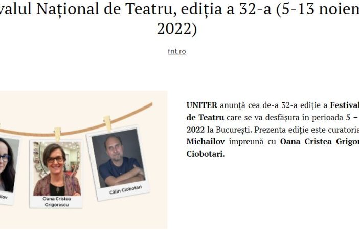 UNITER anunță cea de-a 32-a ediție a Festivalului Național de Teatru care se va desfășura în perioada 5 – 13 noiembrie 2022 la București. Prezenta ediție este curatoriată de Mihaela Michailov împreună cu Oana Cristea Grigorescu și Călin Ciobotari. Spectacolele, evenimentele și manifestările incluse în programul Festivalului vor fi subsumate temei FNT 2022 – Granițe fragile. Istorii fluide. „Într-un timp al convulsiilor socio-politice, într-un timp în care apartenența la națiune și la valorile naționale se rescrie continuu din perspectiva turbulentelor istorii colective și individuale, FNT 2022 intenționează să exploreze plasări și de-plasări estetice,…
