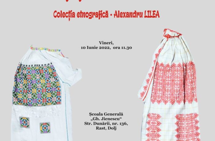 Consiliul Județean Dolj și Centrul Judeţean pentru Conservarea şi Promovarea Culturii Tradiţionale Dolj vă invită vineri, 10 iunie 2022, ora 11:30, la vernisajul expoziției „Costumul popular din Valea Dunării“, la Școala Gimnazială „Gh. Jienescu“ din comuna Rast, județul Dolj. În expoziție regăsim obiecte din colecția lui Alexandru Lilea, interpret de muzică populară, laureat în anul 2017 al Festivalului „Maria Tănase“, ediția a XXIV-a. Expoziția este deschisă în cadrul evenimentului Zilele Comunei Rast – ediția a III-a, organizată cu sprijinul Primăriei și Consiliului Local Rast. Alexandru Lilea pune în cântec frumusețea locului…