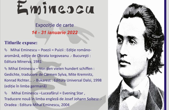 Biblioteca Județeană „Alexandru și Aristia Aman” marchează Ziua Culturii Naționale, precum și împlinirea a 172 de ani de la nașterea lui Mihai Eminescu, prin organizarea unei expoziții de carte, conținând traduceri din opera marelui poet. Expoziția de carte, intitulată „Universalul Eminescu”, poate fi vizitată începând de vineri, 14 ianuarie, până la data de 31 ianuarie 2022, în salonul expozițional al Bibliotecii Județene „Alexandru și Aristia Aman”. Dintre titlurile pregătite de bibliotecarii serviciului Depozit General și Săli de lectură, amintim: Eminescu, Mihai, Poezii = Puizii : Ediţie româno-aromână, ediţie de Chirata…