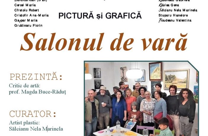 Casa de Cultură ”Traian Demetrescu” organizează joi, 15 iulie 2021, ora 11.00 la Galeria Vollard, vernisajul expoziției de pictură și Grafică ”Salonul de Vară” al Cenaclului de Arte Vizuale ”Arta Amicis”. Expun artiștii plastici: Brădiceanu Dragoș, Balaure Andrei Anuca Maria, Băndică Ioan (Dan), Cercel Maria, Cîrstoiu Robert, Cristofir Ana-Maria, Gașpar Maria, Grădinaru Florin, Jotcar Rody, Popa Emil, Rădulescu Gabriela, Răulea Gena, Sălcianu Nela Marinela, Stuparu Hanelore, Țicudeanu Valentina. Curatorul expoziției: Sălcianu Nela Maria – artist plastic. Prezintă prof. Magda Buce-Răduț – critic de artă.