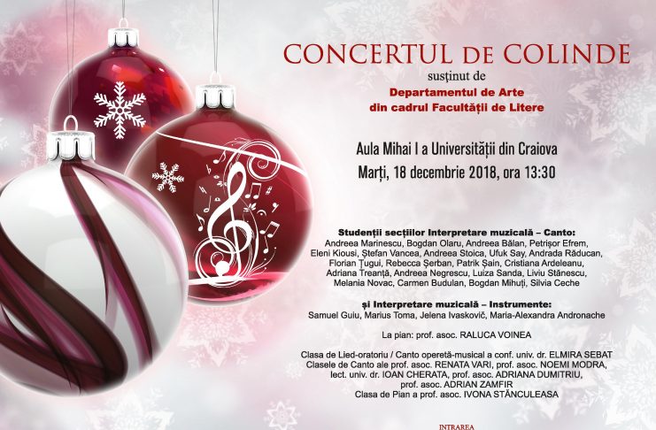 Pe 18 decembrie, de la ora 13.30, în Aula „Mihai I al României”, va avea loc Concertul de colinde susţinut de studenţii domeniului de studii Muzică (Departamentul de Arte, Facultatea de Litere). Studenţii vor interpreta colinde culese şi întocmite de Tiberiu Brediceanu, colinde din cultura nord-americană, dar şi lucrări din repertoriul clasic al virtuozităţii vocale şi instrumentale. Participă: clasa lied-oratoriu/ canto operetă-musical a conf. univ. dr. Elmira Sebat, clasele de Canto ale prof. asoc Renata Vari, prof. asoc. Noemi Modra, lect. univ. dr. Ioan Cherata, prof. asoc. Adriana Dumitriu, prof.…