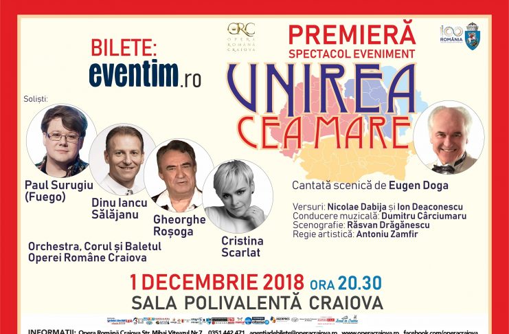 Maestrul Eugen Doga sărbătorește la Craiova Centenarul Marii Uniri. Celebrul compozitor a îmbrățișat cu entuziasm ideea de a compune o lucrare pentru Opera Română Craiova, special pentru eveniment. Paul Surugiu (Fuego), Dinu Iancu Sălăjanu, Gheorghe Roșoga și Cristina Scarlat sunt invitații spectacolului extraordinar „Unirea cea Mare”, de Eugen Doga, eveniment al Operei Române Craiova cu prilejul Centenarului Marii Uniri, pe 1 decembrie 2018, la Sala Polivalentă din Craiova. Spectacolul care reunește peste 100 de artiști, Orchestra, Corul și Baletul Operei Române Craiova, este realizat cu sprijinul Primăriei Municipiului Craiova și…