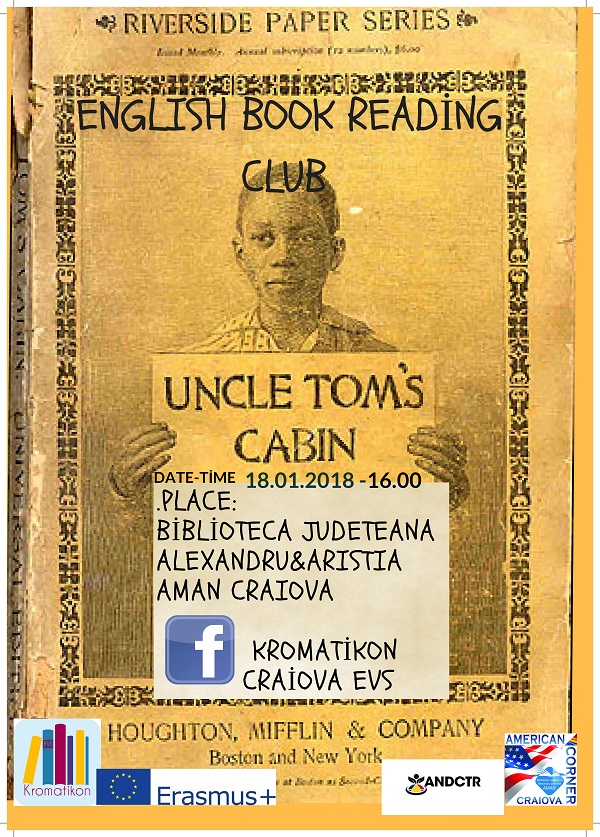 Biblioteca Județeană “Alexandru și Aristia Aman”, în parteneriat cu Asociația Națională de Dezvoltare Continuă a Tinerilor din România, găzduiește joi, 18.01.2018, începând cu ora 16.00, clubul de lectură Reading Club, organizat de studenții Erasmus+, prin proiectul Kromatikon. Tema primei întâlniri a anului este romanul “Coliba unchiului Tom” de Harriet Beecher Stowe. Lunar, studenții Erasmus + organizează întâlniri pe teme literare la Secția Mediatecă și American Corner Craiova cu scopul de a promova cultura, lectura și dezvoltarea spiritului critic în comunitate.