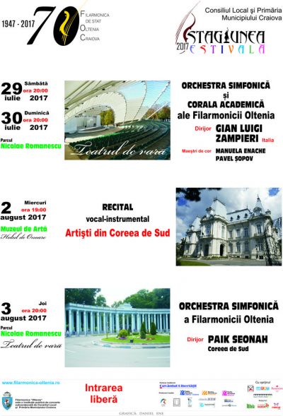 Stagiunea estivală 2017 a Filarmonicii „Oltenia” se desfaşoară (cu mici excepţii) în Parcul Romanescu, la Teatrul de Vară, primele concerte având loc în zilele de 29 şi 30 iulie, ambele la ora 20:00. Orchestra simfonică şi Corala Academică ale Filarmonicii „Oltenia” vor prezenta lucrări binecunoscute publicului – uverturi, arii, duete- sub bagheta dirijorală a maestrului Gian Luigi Zampieri. Sâmbătă, 29 iulie, invitata serii va fi Yoonhee Kim care vine din Coreea de Sud şi va interpreta „Concertul nr. 4 în Re major” de Mozart, pe o vioară Lorenzo Storioni (Cremona…