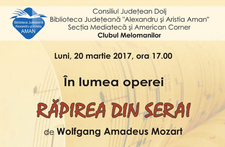 Biblioteca Județeană Alexandru și Aristia Aman și Clubul Melomanilor vă invită luni, 20 martie, ora 17,00 la o nouă întâlnire În lumea operei. Vom urmări împreună spectacolul înregistrat Răpirea din Serai, de W.A. Mozart. Spectacolul este realizat de Teatrul de Marionete din Salzburg. Teatrul de marionete din Salzburg a fost întemeiat în 1913, de către sculptorul Anton Aicher (1859-1930) care și-a petrecut ucenicia la Munchen, realizând marionete ce puteau executa mișcări excepționale, dând impresia că sunt vii. I s-au alăturat și alți membri ai familiei, cunoscând treptat, un succes extraordinar.…