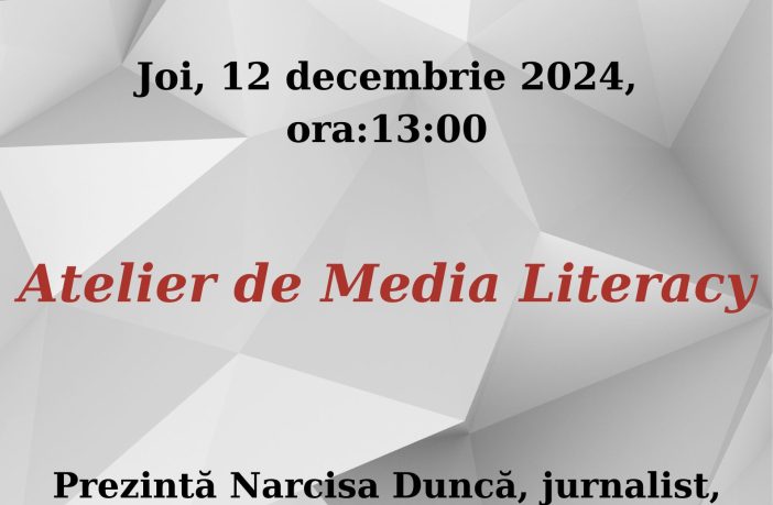 Biblioteca Județeană „Alexandru și Aristia Aman”, prin secția Mediatecă și American Corner Craiova organizează joi, 12 decembrie, ora 13:00, un atelier de „Media Literacy”. Atelierul va fi susținut de Narcisa Dunca, jurnalist, reporter și realizator la Televiziunea Tele „U” Craiova. Atelierul este susținut din grantul anual American Corner Craiova, oferit de Departamentul de Stat al SUA. Obiectivul atelierului este de a conștientiza pericolele pe care le prezintă știrile false. Participanților li se vor prezenta tehnicile folosite pentru diseminarea informațiilor false și impactul pe care aceste practici îl au asupra societății.…
