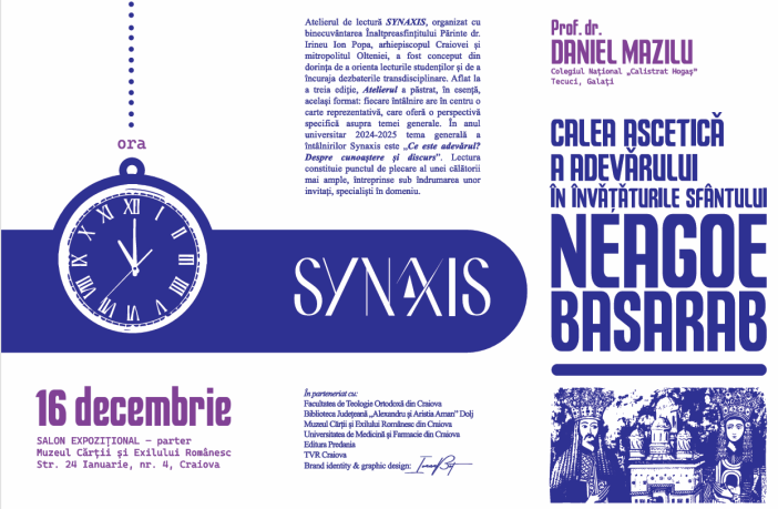 Facultatea de Teologie Ortodoxă din Craiova, în parteneriat cu Muzeul Cărții și Exilului Românesc, cu Biblioteca Județeană „Alexandru și Aristia Aman” Dolj și cu Universitatea de Medicină și Farmacie din Craiova, având partener media TVR Craiova, organizează luni, 16 decembrie a.c., începând cu ora 11.00, conferința „Calea ascetică a Adevărului în Învățăturile Sfântului Neagoe Basarab”. Prelegerea, a treia din cadrul sesiunii 2024-2025 a Atelierelor Synaxis, va fi susținută de prof. dr. Daniel Mazilu, în Salonul Expozițional-parter al Muzeului Cărții și Exilului Românesc din Craiova. Cartea pe care se bazează dezbaterea…