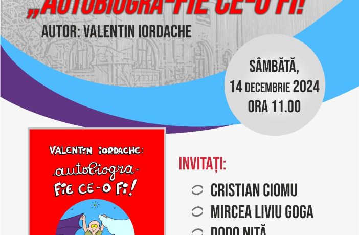 Biblioteca Județeană „Alexandru și Aristia Aman” găzduiește sâmbătă, 14 decembrie, lansarea volumului „Autobiogra-FIE CE-O FI!”, autor Valentin Iordache. Evenimentul va avea loc in sala „Acad. Dinu C. Giurescu”, începând cu ora 11.00, în prezența invitaților: Cristian Ciomu, Mircea Liviu Goga, Dodo Niță. Severineanul Valentin Iordache a fost un profesor de franceză orșovean. Acum, la pensie, locuiește în Craiova, ca un „pur și simplu” autor de benzi desenate. Un autor de benzi desenate este, prin forța și grația lucrurilor, și scriitor și desenator. Valentin a publicat desene și proză în presa…