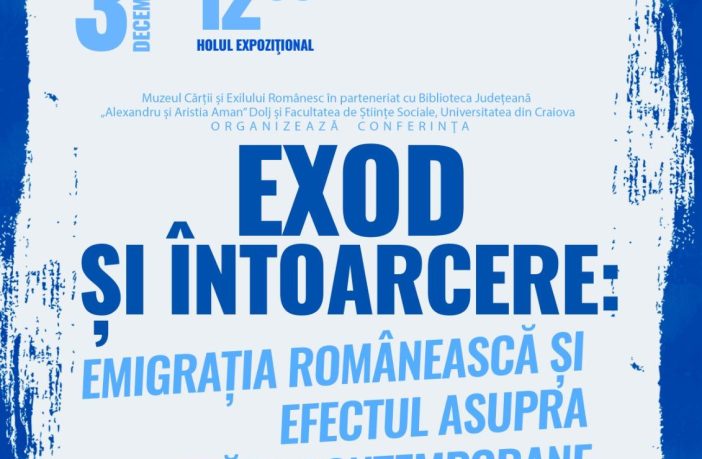 Muzeul Cărții și Exilului Românesc, în parteneriat cu Biblioteca Județeană „Alexandru și Aristia Aman” Dolj și Facultatea de Științe Sociale din cadrul Universității din Craiova organizează marți, 3 decembrie 2024, la ora 12.00, conferința cu tema: „Exod și întoarcere: Emigrația românească și efectul asupra societății contemporane”. La eveniment participă lect. univ. dr. Alexandra Porumbescu de la Facultatea de Științe Sociale, Universitatea din Craiova, care va susține prelegerea intitulată „Exod și întoarcere: Emigrația românească și efectul asupra societății contemporane”, și studenții Facultății de Științe Sociale, Universitatea din Craiova. Conferința este dedicată dimensiunii…