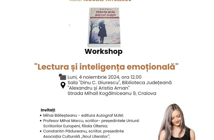 Biblioteca Județeană „Alexandru și Aristia Aman” găzduiește luni, 4 noiembrie, lansarea volumului „Pelerin prin miezul nopții”, autor Nicolae Tătulescu, și workshop-ul „Lectura și inteligența emoțională”, organizat de Asociația pentru Copii și Tineret Pro Reziliența, în parteneriat cu Palatul Copiilor Craiova, Colegiul Național „Elena Cuza” și Liceul Teoretic „Tudor Arghezi”, Craiova. Evenimentul va avea loc in sala „Acad. Dinu C. Giurescu”, începând cu ora 12.00, în prezența invitaților: Mihai Băileșteanu, Mihai Marcu, Constantin Pădureanu, Ion Dascălu, elevi și profesori ai școlilor partenere, membri ai Asociația pentru Copii și Tineret Pro Reziliența.…