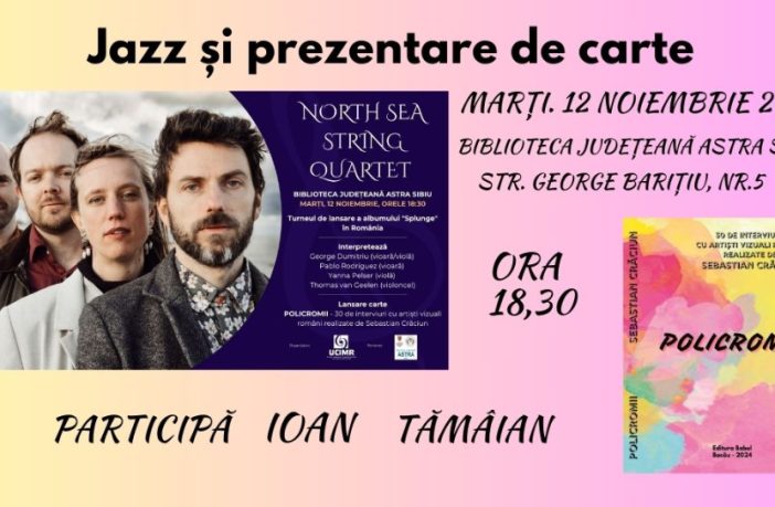 North Sea String Quartet vine la Biblioteca Județeană ASTRA Sibiu, marți, 12 noiembrie, orele 18:30, pentru un popas al turneului de lansare a albumului lor de debut: #Splunge. Tot atunci, va fi prezentată cartea „Policromii”, scrisă de Sebastian Crăciun, realizator radio. Având o prefață semnată de criticul de artă Marius Tița, cartea „Policromii”, apărută la Editura Babel din Bacău, cuprinde 30 de interviuri cu personalități din lumea artelor vizuale precum: academicienii Răzvan Theodorescu și Mircia Dumitrescu, pictorii: Gheorghe Coman, Valeriu Șușnea, Petru Lucaci, Gheorghe Dican, Felix Aftene, Tudor Zbârnea, sculptorii:…