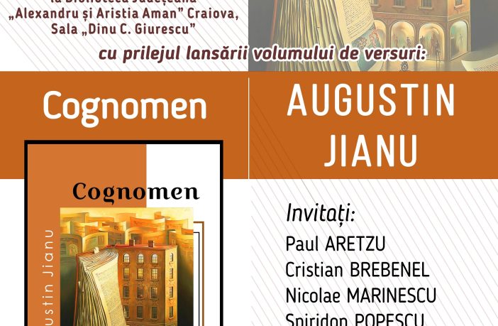 Biblioteca Județeană „Alexandru și Aristia Aman” găzduiește joi, 11 iulie 2024, lansarea volumului „Cognomen”, autor Augustin Jianu. Evenimentul va avea loc in sala „Acad. Dinu C. Giurescu”, începând cu ora 17.00, în prezența invitaților: Paul Aretzu, Cristian Brebenel, Nicolae Marinescu, Spiridon Popescu, Camelia Radulian, Ștefan Vlăduțescu. Moderator al evenimentului este Petrișor Militaru. Mircea Suchici, Janina Spiridon, Dan State vor oferi un moment artistic participanților la eveniment. Augustin Jianu a debutat în 2018 cu volumul „Poezii” (Editura Scrisul Românesc), urmat apoi de „Bubble gum” (Editura Aius, 2023), iar ca de-a treia…