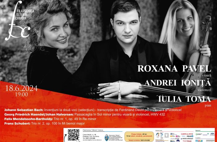 Iubitorii muzicii de cameră sunt invitați la Filarmonica Oltenia la recitalul ”De la baroc la romantic” care va avea loc marți, 18 iunie 2024, de la ora 19:00. Evenimentul va fi susținut de trei tineri artiști: Roxana Pavel (vioară), Andrei IoniȚĂ (violoncel) și Iulia Toma (pian) ce vor oferi o seară de muzică clasică, de la BACH la SCHUBERT. În program: Johann Sebastian Bach: Selecțiuni din Invențiunile la două voci, transcripție pentru vioară și violoncel de Ferdinand David. Aceste piese evidențiază dialogul muzical și virtuozitatea celor doi instrumentiști. Georg Friedrich Haendel/Johan…