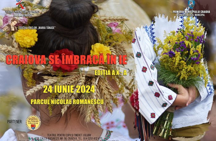 Teatrul pentru copii și tineret Colibri – Secția Folclor „Maria Tănase“, în parteneriat cu Primăria, Consiliul Local al Municipiului Craiova și Muzeul Olteniei Craiova, organizează cea de-a X-a ediție a evenimentului „Craiova se îmbracă în ie“, luni, 24 iunie 2024, când sunt sărbătorite Sânzienele și este celebrată Ziua Universală a Iei, zi care a debutat în 2013 la inițiativa comunității online „La Blouse Roumaine“. Evenimentul „Craiova se îmbracă în ie“ se va desfășura în Parcul „Nicolae Romanescu“ și va cuprinde expoziții, ateliere, tradiționala paradă a iei și spectacol de muzică populară.…