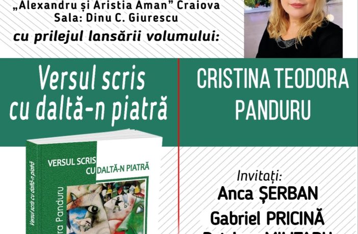 Biblioteca Județeană „Alexandru și Aristia Aman” găzduiește vineri, 31 mai 2024, lansarea volumului „Versul scris cu daltă-n piatră”, autor Cristina Teodora Panduru. Evenimentul va avea loc in sala „Acad. Dinu C. Giurescu”, începând cu ora 17.00, în prezența invitaților: Anca Șerban, Gabriel Pricină, Petrișor Militaru. Moderator al evenimentului este Nicolae Marinescu. „Poemele din noul volum al Cristinei Teodora Panduru sunt semnul unei maturizări poetice, sunt texte de maximă autenticitate poetică prin care ea a cucerit noi continente interioare ale cunoașterii de sine și prin care ne împărtășește cele mai intime…