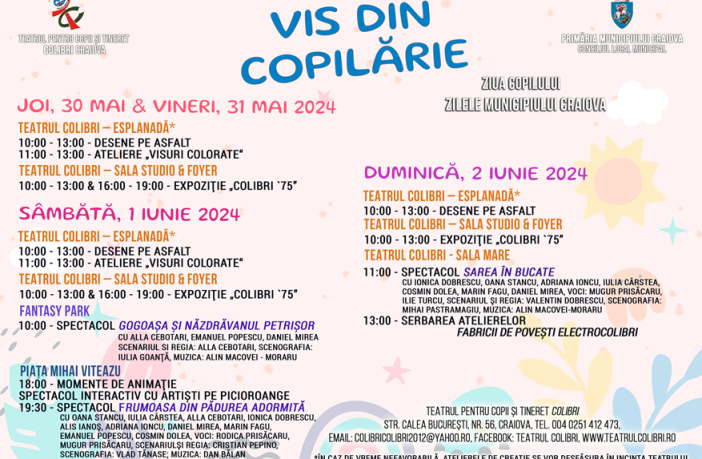 Teatrul pentru copii şi tineret Colibri transformă într-un vis din copilărie participarea la cea de-a XXVII-a ediție a Zilelor Municipiului Craiova. În perioada 30 mai – 02 iunie 2024 ne bucurăm de ateliere creative, vesele și educative, expoziții, serbarea atelierelor și spectacole cu păpuși la teatru, în Fantasy Park și în Piața Mihai Viteazu. Programul este următorul: JOI, 30 MAI TEATRUL COLIBRI – Esplanadă* 10:00 – 13:00 – Desene pe asfalt 11:00 – 13:00 – Ateliere „Visuri colorate“ TEATRUL COLIBRI – Sala Studio & Foyer 10:00 – 13:00 & 16:00 – 19:00 – Expoziție „Colibri `75” …
