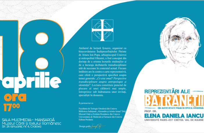 Facultatea de Teologie Ortodoxă din Craiova, în parteneriat cu Biblioteca Județeană „Alexandru și Aristia Aman” Dolj, cu Universitatea de Medicină și Farmacie din Craiova, cu Muzeul Cărții și Exilului Românesc și cu Editura Predania, organizează joi, 18 aprilie 2024, începând cu ora 17, la Muzeul Cărții și Exilului din Craiova, în Sala multimedia – mansardă, cea de a șaptea conferință a Atelierul Synaxis, intitulată „Reprezentări ale bătrâneții în istorie: din Antichitate până în epoca modernă”. Prelegerea va fi susținută de prof. dr. Elena Daniela Iancu, cadru didactic și coordonator de…