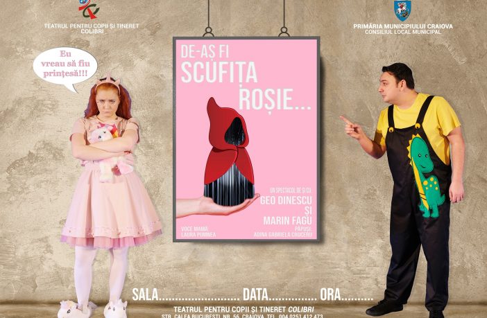 Teatrul pentru copii și tineret Colibri Craiova ne-a pregătit un week-end de joacă și visare alături de actorii Andreea Ionescu, Marin Fagu, Oana Stancu, Emanuel Popescu, Daniel Mirea, Adriana Ioncu, Robert Iovan, Ionica Dobrescu, Alla Cebotari. Sâmbătă, 17 februarie 2024, ora 18:00 este despre spectacolul „De-aș fi Scufița Roșie“, un spectacol muzical, pentru toată familia, adaptare după Frații Grimm, regia și scenariul Geo Dinescu și Marin Fagu, scenografia Geo Dinescu, muzica Marin Fagu, distribuția: Geo Dinescu / Andreea Ionescu, Marin Fagu. Clasica poveste a Fraților Grimm este reinterpretată prin prisma a doi…