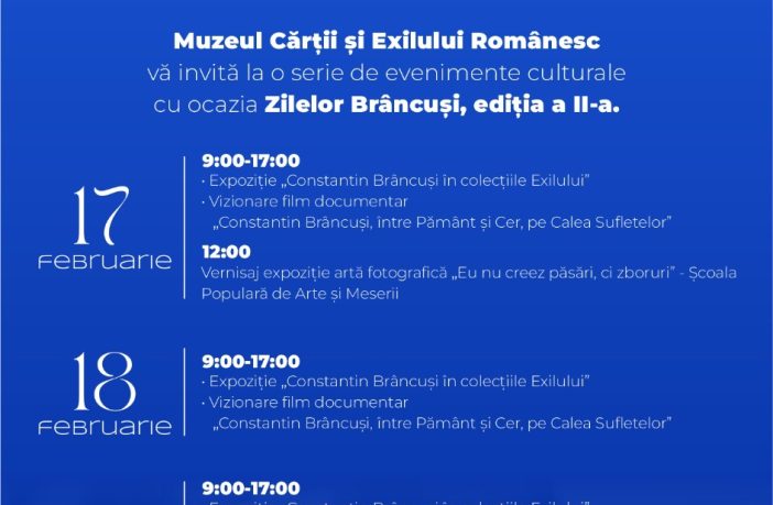 Muzeul Cărții și Exilului Românesc participă la cea de-a doua ediție a Zilelor Brâncuși, organizată de Consiliul Județen Dolj, cu o serie de evenimente culturale, dedicate împlinirii a 148 de ani de la nașterea marelui sculptor oltean. Pe parcursul a trei zile, în intervalul 17-29 februarie 2024, Muzeul Cărții și Exilului Românesc își așteaptă vizitatorii cu trei expoziții de artă și fotografie și o masă rotundă, intitulată „Brâncuși în Exil. Forme, Concepte și sincronism în opera lui Constantin Brâncuși”. Sâmbătă, 17 februarie 2024 Orele 09.00-17.00 -Expoziție „Constantin Brâncuși în colecțiile…