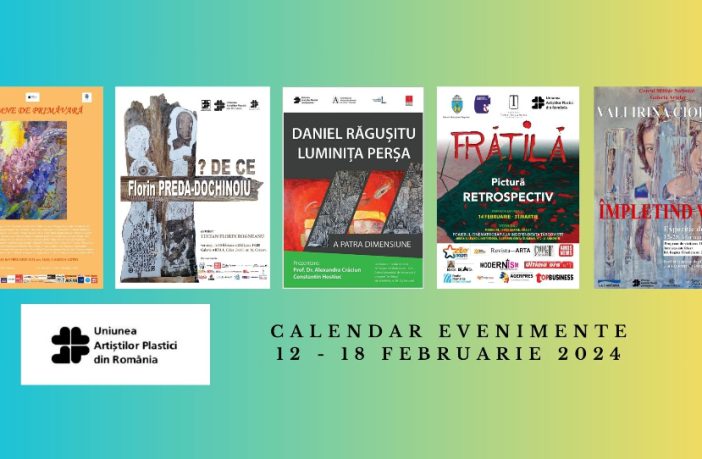 Luni, 12 februarie, Galeria Artelor a Cercului Militar Național va găzdui la ora 18, vernisajul expoziției „Împletind vise” a pictoriței Vali Irina Ciobanu. Prezintă: Luiza Barcan si Valentin Tănase. Miercuri, 14 februarie, la ora 17, în foaierul cinematografului „Independența” din Târgoviște (Str. Libertății nr. 2-2C), va avea loc vernisajul expoziției „Retrospectiv” a pictorului Marius Frățilă, care iată ce a declarat: „prezint în această expoziție cu caracter retrospectiv, patru dintre preocupările și explorările mele tematice – ”Bucătării Impersonale”, compoziții cu tematica „Alb Tolerat, lucrări cu tematică generică ”Transformări Vegetale” și creații din seria ”Psihic…