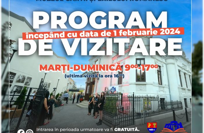 Muzeul Cărții și Exilului Românesc anunță că, începând cu data de 1 februarie 2024, programul de vizitare al muzeului este de marți până duminică, între orele 9-17, ultima oră de intrare fiind 16.30. Vizitatorii sunt așteptați oricând, în acest interval, iar intrarea este liberă, fără bilet de intrare, în perioada următoare accesul fiind gratuit. Pentru grupurile organizate, punem la dispoziție o adresă de corespondență, prin intermediul cărei se vor face programările – office@muzeulexiluluiromânesc.ro. Unicitatea celor 42 de colecții din Muzeu este dată de remarcabila lor diversitate, ușor de observat, mai…