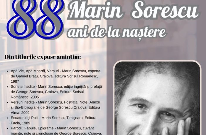 Biblioteca Județeană „Alexandru și Aristia Aman”, prin Secția Depozit General și săli de lectură, organizează expoziția intitulată „MARIN SORESCU – 88 de ani de la naștere”. Expoziția este disponibilă în holul de la parterul instituției, în perioada 1 februarie – 29 februarie 2024. Dintre titlurile expuse amintim: – Apă vie, apă moartă, versuri, Marin Sorescu, Coperta de Gabriel Bratu, Craiova, Editura Scrisul Românesc, 1987 – Sonete inedite, Marin Sorescu, ediţie îngrijită şi prefaţă de George Sorescu, Craiova, Editura Scrisul Românesc, 2005 – Versuri inedite, Marin Sorescu, postfaţă, note, anexe şi…