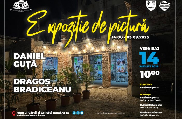 Muzeul Cărții și Exilului Românesc organizează joi, 14 august 2025, la ora 10.00, vernisajul expoziției de pictură a artiștilor plastici Daniel Guță și Dragoș Bradiceanu, curator Emilian Popescu. Expoziția, care va putea fi vizitată până pe data de 3 septembrie, cuprinde 24 de lucrări ale artistului Daniel Guță și 11 lucrări semnate de artistul Dragoș Bradiceanu. Printre exponate se află și lucrări de mari dimensiuni. La vernisajul expoziției participă Emilian Popescu, prof. dr. Arte Vizuale, prof. Ovidiu Bărbulescu, Uniunea Artiștilor Plastici din România, filiala Dolj, și Nicolae Marinescu, director Editura…