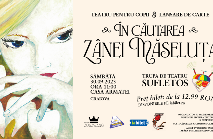 Editura Zugzwang şi Bebevesel te invită la o nouă aventură sâmbătă, 30 septembrie, la orele 11.00, la Casa Armatei din Craiova. Pregătim un spectacol de teatru muzical pentru întreaga familie, adaptat după noua carte pentru copii, cu titlul ”În căutarea Zânei Măseluță”, de Andreia Birtu cu ilustrații de Ioana Fluerașu. Interpretarea şi muzica sunt asigurate de către Anca Grosu şi Ioana Rizea, adică Trupa Sufletos din Bucureşti. ”În căutarea Zânei Măseluță” este o poveste despre curaj, puterea fraților de a face lucrurile împreună, suspans în descoperirea de noi teritorii și bucuria de a fi din nou acasă. Povestea răspunde la…