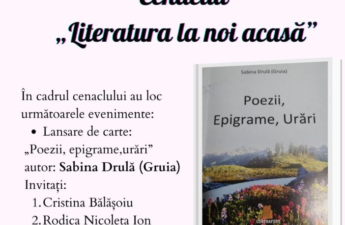 Biblioteca Județeană „Alexandru și Aristia Aman” găzduiește joi, 7 septembrie 2023, în sala „Acad. Dinu C. Giurescu”, la ora 16.00, o nouă întâlnire a Cenaclul „Literatura la noi acasă”. În cadrul întâlnirii va fi lansat volumul „Poezii, epigrame, urări”, autor Sabina Drulă (Gruia). La lansarea volumului vor lua cuvântul invitații Cristina Bălășoiu și Rodica Nicoleta Ion, care vor lectura apoi pentru participanți propriile creații.