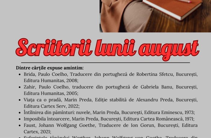 Biblioteca Județeană „Alexandru și Aristia Aman”, prin Secția Depozit General și săli de lectură, organizează expoziția intitulată „Scriitorii lunii august”. Expoziția este disponibilă în holul de la parterul instituției, în perioada 9 – 31 august 2023. Dintre cărțile expuse amintim: Brida, Paulo Coelho, traducere din portugheză de Robertina Sfetcu, Bucureşti, Editura Humanitas, 2008; Zahir, Paulo Coelho, traducere din portugheză de Gabriela Banu, Bucureşti, Editura Humanitas, 2005; Viața ca o pradă, Marin Preda, ediție stabilită de Alexandru Preda, Bucureşti, Editura Cartex Serv, 2022; Întîlnirea din pămînturi: nuvele, Marin Preda, Bucureşti, Editura…