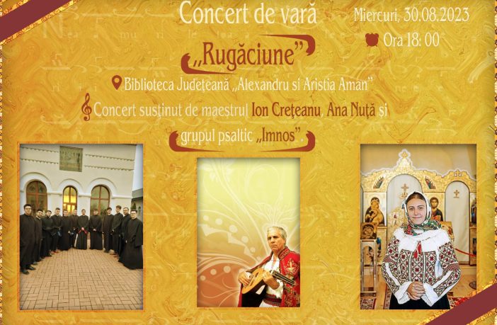 Biblioteca Județeană „Alexandru și Aristia Aman” găzduiește miercuri, 30 august 2023, Concertul de Vară „Rugăciune”. Concertul se desfășoară la Biblioteca Județeană „Alexandru și Aristia Aman”, începând cu ora 18.00, în sala „Acad. Dinu C. Giurescu” și este susținut de către maestrul Ion Crețeanu, Ana Nuță, și grupul psaltic „Imnos”. „Maestrul Ion Crețeanu, împreună cu psaltic Imnos și solista Ana Nuță au gândit să ofere publicului larg, prin organizarea acestui concert la Biblioteca Aman, o parte din cântecul bisericesc. La eveniment sunt invitați enoriașii bisericilor craiovene, precum și toți iubitorii de…