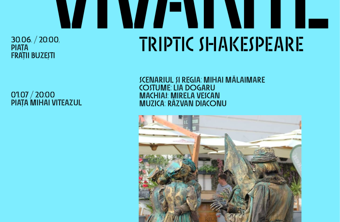 Casa de Cultură „Traian Demetrescu”, Craiova vă invită vineri 30 iunie, ora 20:00, în Piața „Frații Buzești” și sâmbătă, 1 iulie, de la aceeași oră în Piața „Mihai Viteazul”, la spectacolul de statui vivante – Triptic Shakespeare, regizat de Mihai Mălaimare. Spectacolul face parte din proiectul Outdoors – Statui Vivante prin care ne dorim să creăm puncte a atracție în centrul vechi al Craiovei și nu numai, prin momente artistice deosebite. Prin acest proiect ne propunem să aducem publicul cât mai aproape de actul cultural și să sprijinim participarea tinerilor…