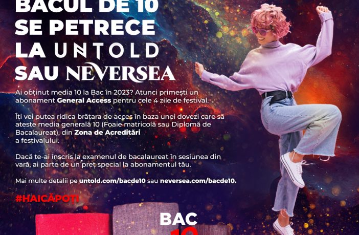 Elevii de 10 ai României primesc intrare gratuită la festival Organizatorii UNTOLD și Neversea sunt alături de elevii de 10 ai României într-o nouă inițiativa “BAC DE 10”. Performanța elevilor de 10 va fi recompensată cu experiențe memorabile și anul acesta. Ajunsă la cea de-a 9-a ediție, cea mai longevivă campanie de încurajare a performanței prin educație va premia elevii care obțin nota 10 la examenul de Bacalaureat, cu acces gratuit la unele dintre cele mai mari festivaluri din lume, UNTOLD sau Neversea. Edy Chereji, Co-Fondator UNTOLD și Neversea: „Campania…