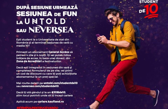 Organizatorii UNTOLD și Neversea, unele dintre cele mai mari festivaluri din lume răsplătesc și în acest an excelența studenților de 10 din România, oferindu-le experiențe memorabile în cadrul campaniei “Student de 10”. Campania, care susține performanța în educație, va premia studenții de la universitățile de stat care trec sesiunea de vară cu nota 10 cu acces gratuit la UNTOLD sau Neversea. Edy Chereji, Co-Fondator UNTOLD și Neversea: “Această campanie, “Student de 10”, este o campanie care aduce multă bucurie in rândul tinerilor cu rezultate excelente. E momentul în care răsplătim…