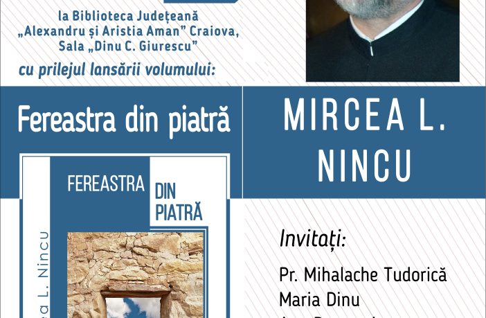 Biblioteca Județeană „Alexandru și Aristia Aman” organizează marți, 6 iunie 2023, în sala „Academician Dinu C. Giurescu”, începând cu ora 17.00, lansarea volumului „Fereastra din piatră”, autor Mircea L. Nincu. La acest eveniment, al cărui moderator este Petrișor Militaru, vor participa invitații: pr. Tudorică Mihalache, Maria Dinu și Ana Paraschivescu. Mircea Nincu a absolvit facultatea de Teologie a Universității din Craiova și este doctor în fenomenologie religioasă. Din 2001 este preot paroh la Parohia Sf. Ier. Petru Movilă și Sf. Cuv. Parascheva din Craiova. Din februarie 2017 este membru al…