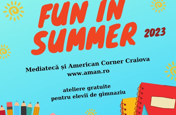 Biblioteca Județeană „Alexandru și Aristia Aman”, prin compartimentul Mediatecă și American Corner Craiova, continuă seria de activități gratuite, desfășurate în fiecare vară în cadrul programului Fun in Summer. Activitățile propuse pentru lunile iunie, iulie și august (8 săptămâni, în perioada 19 iunie – 11 august) se vor desfășura fizic, la sediul Bibliotecii Aman (în sala Marin Sorescu, compartimentul Mediatecă și American Corner) și se adresează elevilor de gimnaziu (clasele V-VIII). Înscrierile se realizează în perioada 6 – 16 iunie, în intervalul orar 09.00 – 15.00, în limita locurilor disponibile: 1.…