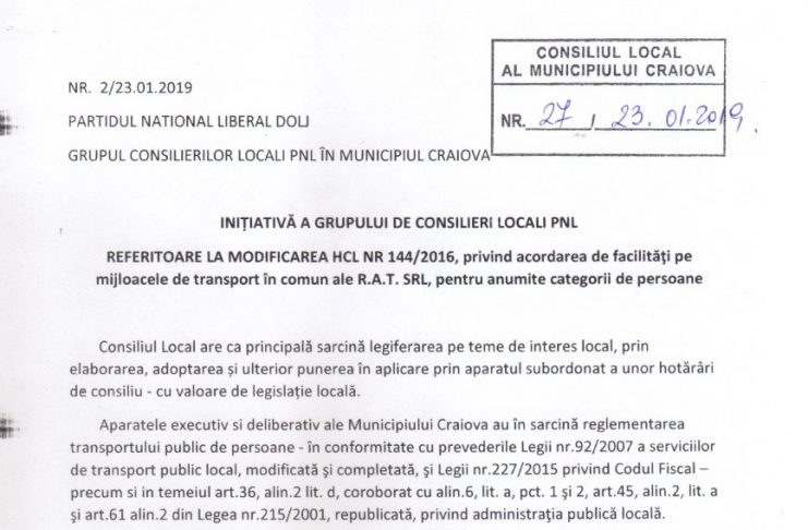PNL Dolj rămâne consecvent în susținerea măsurilor ce pot sprijini actul educațional și își reafirmă deschiderea față de societatea civilă și propunerile acesteia. Astfel, în urma discuțiilor purtate cu reprezentanții Consiliului Județean al Elevilor, care a solicitat gratuitate pentru elevi pe toate mijloacele de transport în comun administrate de Primăria Municipiului Craiova, grupul consilierilor municipali PNL Craiova a depus astăzi, 23.01.2019, la sediul primăriei, o Inițiativă de Consiliu Local care preia propunerea apărută recent în spațiul public. Inițiativa are menirea de a modifica prevederile hotărârii nr. 144/2016, în sensul acordării…