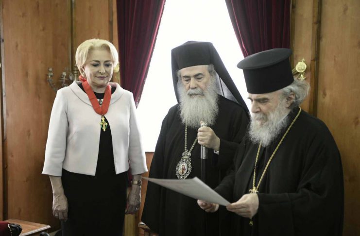 Viorica Dăncilă a primit ”Crucea Sfântului Mormânt”, cea mai înalta distincție a Patriarhiei Ierusalimului, în cadrul întâlnirii cu Prea Fericitul Teophilos al III-lea, Patriarhul Ierusalimului, care a avut loc astăzi la Ierusalim. Discuțiile au evidențiat bunele relații dintre Patriarhia Bisericii Ortodoxe Române și Patriarhia Ierusalimului, precum și teme de interes care vizează promovarea toleranței și a dialogului interconfesional, combaterea stereotipurilor negative și periculoase cu privire la religii, rase sau sexe, precum și situația de securitate a creștinilor în regiunile aflate în conflict, în special din Orientul Mijlociu și Nordul Africii.…