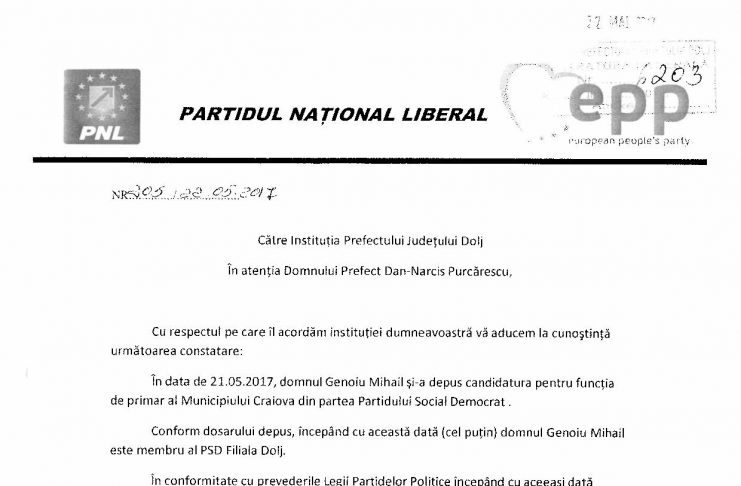 Într-un comunicat remis presei Partidul Național liberal a precizat următoarele: „Consecvent celor declarate ieri, cu ocazia depunerii candidaturii domnului Mario Ovidiu Oprea, astăzi, 22.05.2017, PNL DOLJ a solicitat în scris prefectului județului Dolj, domnul Dan Narcis Purcărescu, vacantarea postului de consilier local al domnului Mihail Genoiu și, implicit, demiterea sa din demnitatea de viceprimar cu atribuții de primar interimar al Craiovei. Speriat, probabil, de amploarea scandalului și de eventualele repercursiuni electorale, la două ore distanță, domnul Mihail Genoiu a convocat de urgență o ședință extraordinară a Consiliului Local Craiova, având…