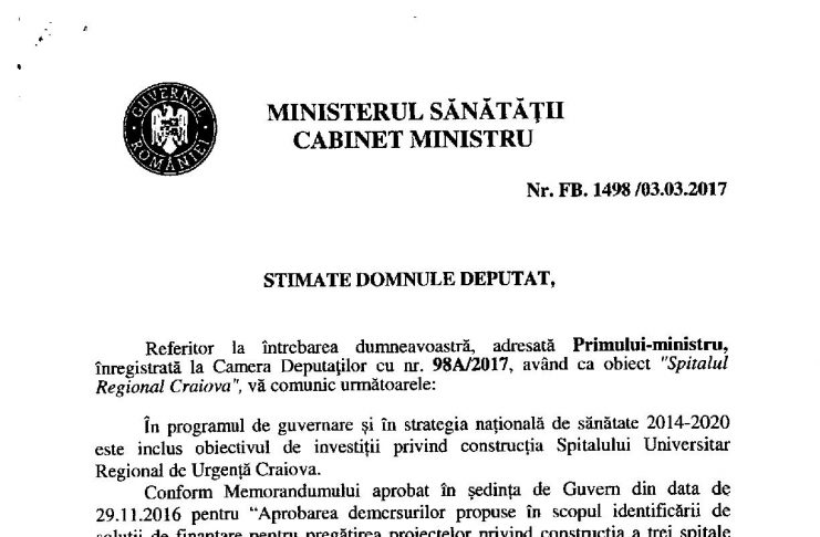 Lucrările de construcţie la Spitalul Regional din Craiova ar putea să înceapă în al doilea semestru al anului 2018. O investiție gigantică pentru zona Craiovei și nu numai va aduce nu doar locuri de muncă ci va ridica standardele medicale la nivelul meritat pentru locuitorii acestei zone greu încercate. Am primit în urmă cu câteva zile răspunsul din partea Ministerului Sănătății cu privire la stadiul proiectului Spitalului Regional Craiova demarat anul trecut. Plăcută mi-a fost surpriza să văd că, spre deosebire de autostrada Craiova-Pitești, proiectul celui mai mare spital din…
