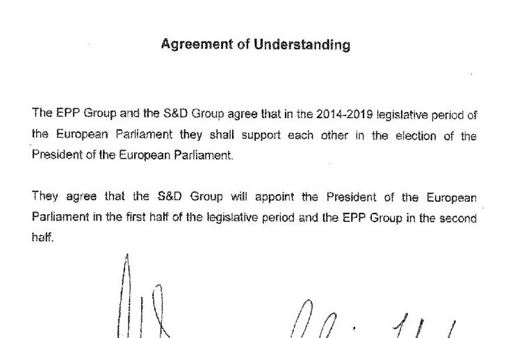 În anul 2014 Grupul PPE, Grupul Socialist și Grupul ALDE au căzut de acord să sprijine aceiași candidați pentru poziția de Președinte al Parlamentului European (PE) pe durata legislaturii 2014-2019 după cum urmează: În prima jumătate a mandatului, socialistul Martin Schulz (Germania), a fost ales Președinte cu sprijinul Grupului PPE, urmând ca în a doua parte a mandatului, funcția să revină celui mai mare grup din PE, Grupul PPE (centru-dreapta). Numai căodată cu începerea celui de al doilea mandat de 2 ani și 6 luni, socialiștii europeni au ales să…