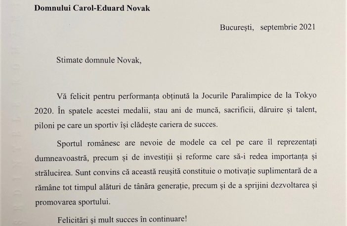 Ministrul în funcție al Tineretului și Sportului a fost felicitat de către președintele României pentru performanțele obținute în cadrul Jocurilor Pralimpice de la Tokyo. „Vă mulțumesc, domnule Președinte! Sper să pot rămâne cât mai mult alături de tineri, sportivi și de părinții lor, prin proiecte viabile, care să aducă sportul ca o prioritate în viața tuturor!”, a precizat Eduard Novak pe o rețea de socializare.