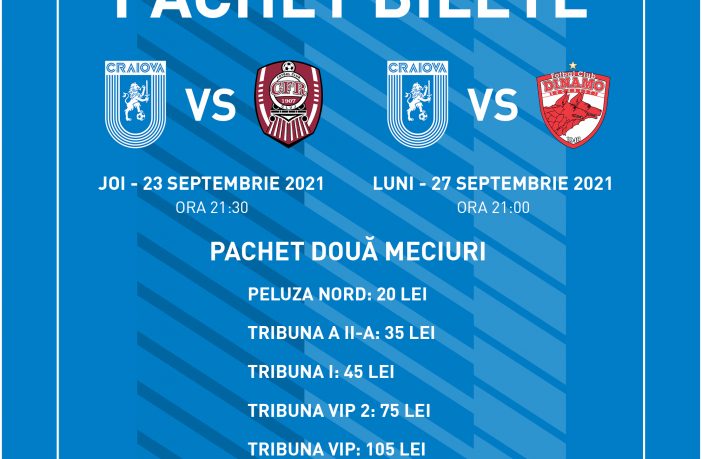 Clubul Sportiv Universitatea Craiova a anunțat, cu puțin timp în urmă, punerea în vânzare a unui pachet special pentru cele două meciuri importante ale alb-albaștrilor, cel cu CFR Cluj, respectiv cel cu Dinamo. „Cumpără ð¼ð¾ðð bilet la derby-ul cu Dinamo și plătești doar 5 lei pentru a fi în tribunele „vulcanului” alb-albastru și la duelul cu CFR Cluj din Cupa României. PACHET DOUĂ MECIURI PELUZA NORD: 20 Lei TRIBUNA A II-A: 35 lei TRIBUNA I: 45 lei TRIBUNA VIP 2: 75 lei TRIBUNA VIP: 105 lei Biletul de acces în…
