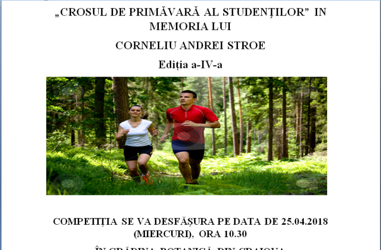 Facultatea de Educaţie Fizică şi Sport (Universitatea din Craiova) în parteneriat cu Asociația PROEFS şi DJTS DOLJ organizează „Crosul de primăvară al studenţilor”, ediția a-IV-a, în memoria lui CORNELIU ANDREI STROE. Competiţia se va desfăşura pe 25.04.2018 (miercuri), ora 10.30, în Grădina Botanică din Craiova. Înscrierile încep la ora 9.45. Sunt invitaţi să participe toţii studenţii Universităţii din Craiova. Coordonatorii competiţiei sunt conf.univ.dr. Alina Elena Albină şi conf.univ.dr. Constantin Albină.
