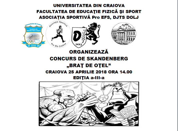 Facultatea de Educaţie Fizică şi Sport (Universitatea din Craiova) în parteneriat cu Asociația Sportivă ProEfs şi DJTS Dolj organizează concursul de skandenberg ,,Braţ de Oţel”, ediţia a III-a, pe 25 aprilie 2018, ora 14.00. Participă exclusiv studenţi: băieţi -80KG şi +80KG, fete: open, dreapta şi stânga. Data limită de înscriere: 25.04.2018. Cântarul: 25.04.2018 ora 13.30, AULA I FEFS, STR.Brestei NR.156. Persoană de contact: Conf.univ.dr. ALBINĂ CONSTANTIN