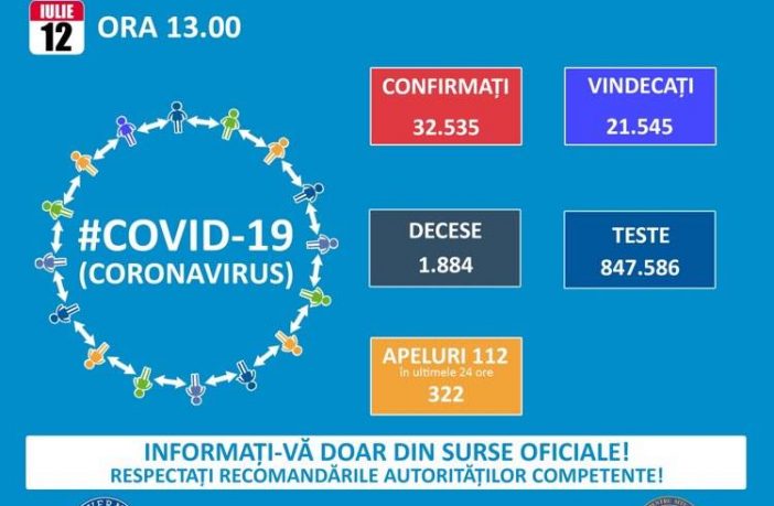Până astăzi, 12 iulie, pe teritoriul României, au fost confirmate 32.535 de cazuri de persoane infectate cu noul coronavirus (COVID – 19). Dintre persoanele confirmate pozitiv, 23.387 au fost externate, dintre care 21.545 de pacienți vindecați și 1.842 de pacienți asimptomatici, externați la 10 zile după depistare. Totodată, până în prezent, 532 de pacienți cu test pozitiv au fost externați la cerere. Numărul de cazuri confirmate, pe județe, potrivit raportării Institutului Național de Sănătate Publică: Nr. crt. Județ Număr de cazuri confirmate 1. Alba 493 2. Arad 714 3. Argeș…