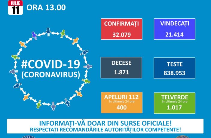 Până astăzi, 11 iulie, pe teritoriul României, au fost confirmate 32.079 de cazuri de persoane infectate cu noul coronavirus (COVID – 19). Dintre persoanele confirmate pozitiv, 23.613 au fost externate, dintre care 21.414 de pacienți vindecați și 1.793 de pacienți asimptomatici, externați la 10 zile după depistare și 406 pacienți externați la cerere cu test pozitiv. Numărul de cazuri confirmate, pe județe, potrivit raportării Institutului Național de Sănătate Publică: Nr. crt. Județ Număr de cazuri confirmate 1. Alba 491 2. Arad 713 3. Argeș 1.284 4. Bacău 744 5. Bihor…
